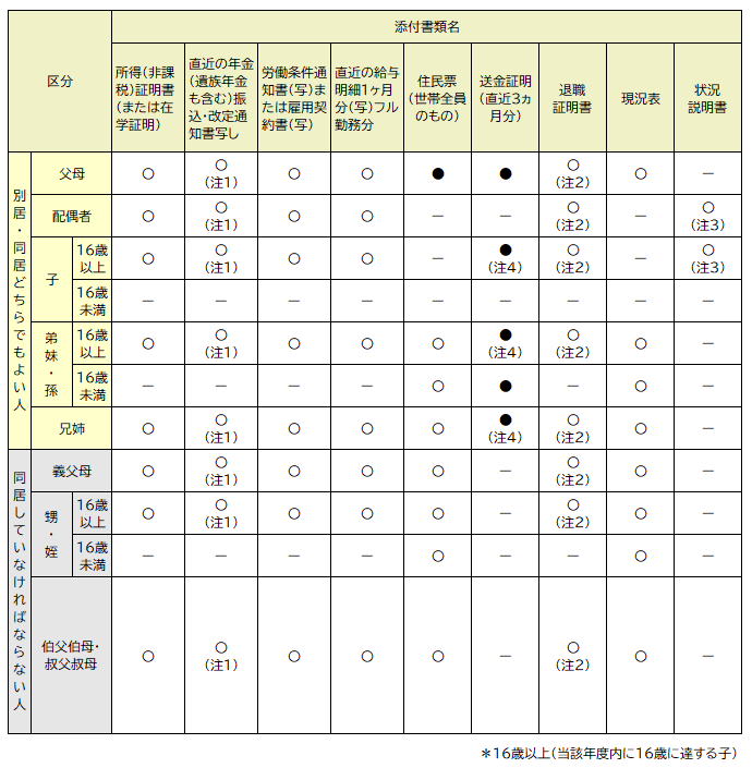 - ※(注3)配偶者・16歳以上の子については「状況説明書」を添付してください。また、その他の添付書類については、上表の区分「16歳以上」を参照してください。